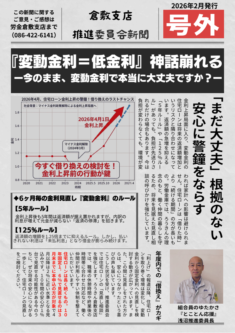 中国労働金庫倉敷支店では、安心して将来を迎えていただけるよう、住宅ローンの見直し相談を強化しています。